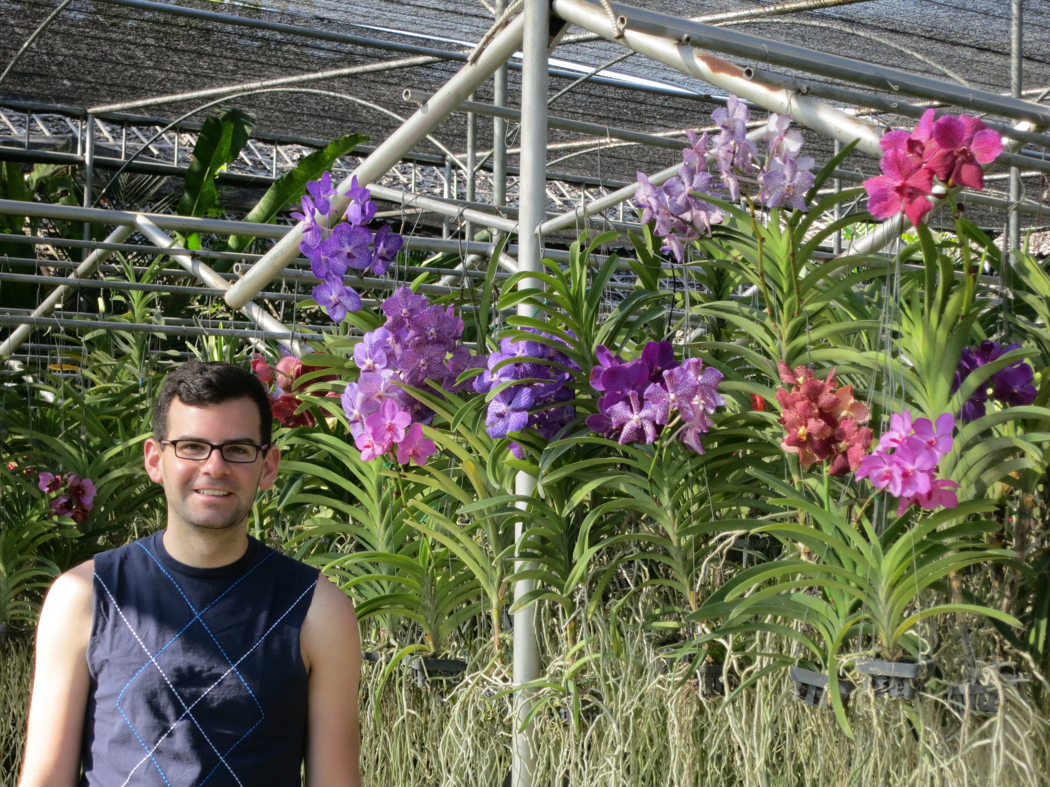 The last full day in Chiang Mai! We decided that we wanted to leave the city, and so we scheduled an outdoor tour in the Chiang Mai countryside today. The tour started at 8:30 AM, when we were picked up in front of our hotel by a songthaew and our tour group. The first stop on the tour was a visit to a farm which raised both orchids and butterflies named the Bai Orchid-Butterfly farm. The drive took about 30 minutes, and while it wasn’t the most comfortable it wasn’t too bad either. We spent about 30 minutes walking through the rows of orchids and the butterfly pen. It was amazing to see all of the different orchids growing. It gave me a few ideas on ways we could grow orchids in our apartment… another project ahead I suppose. The butterflies were nice to see as well, I think I got a few pretty good photos of them which I am excited to see.Todd in the orchid farm