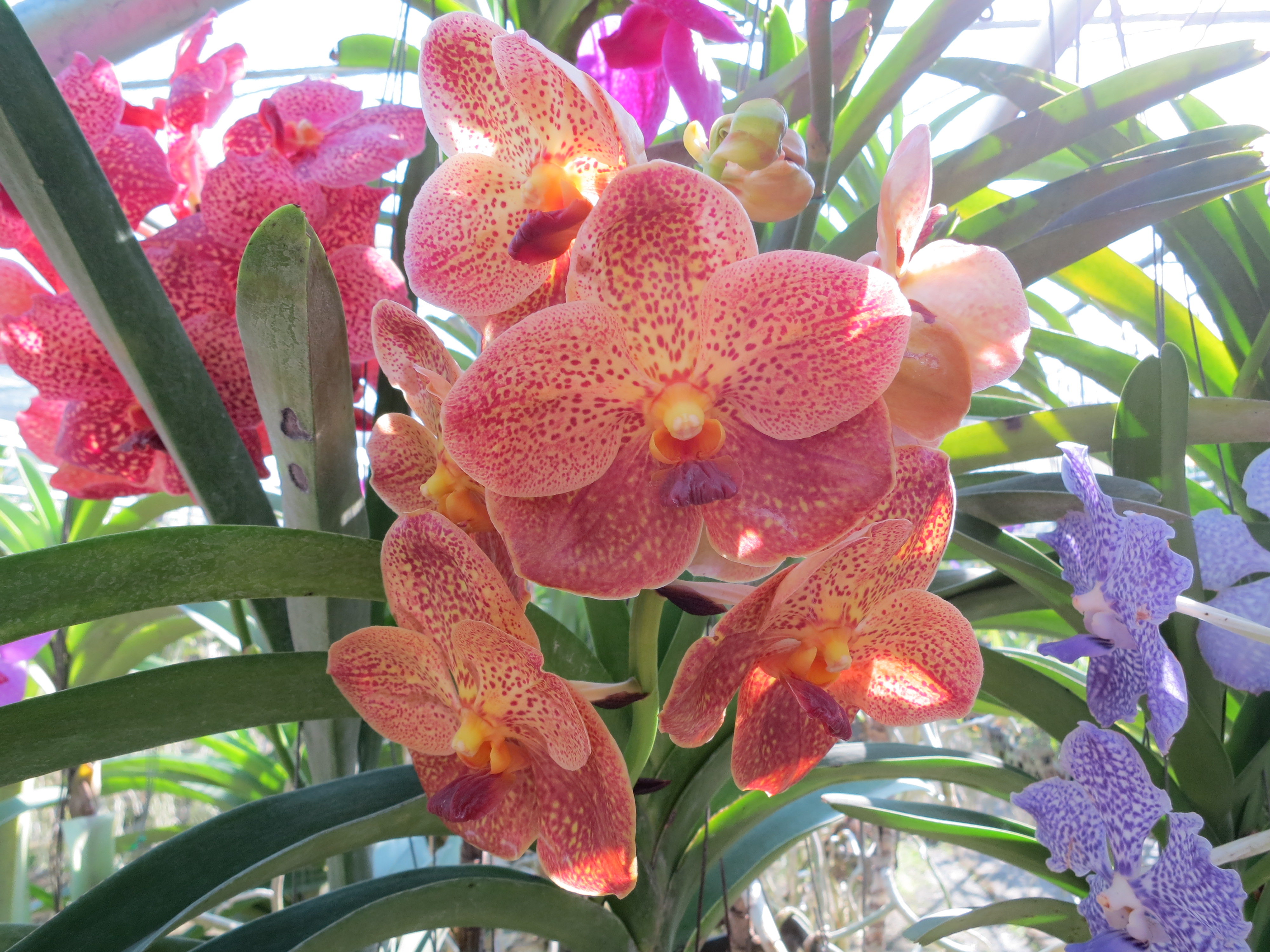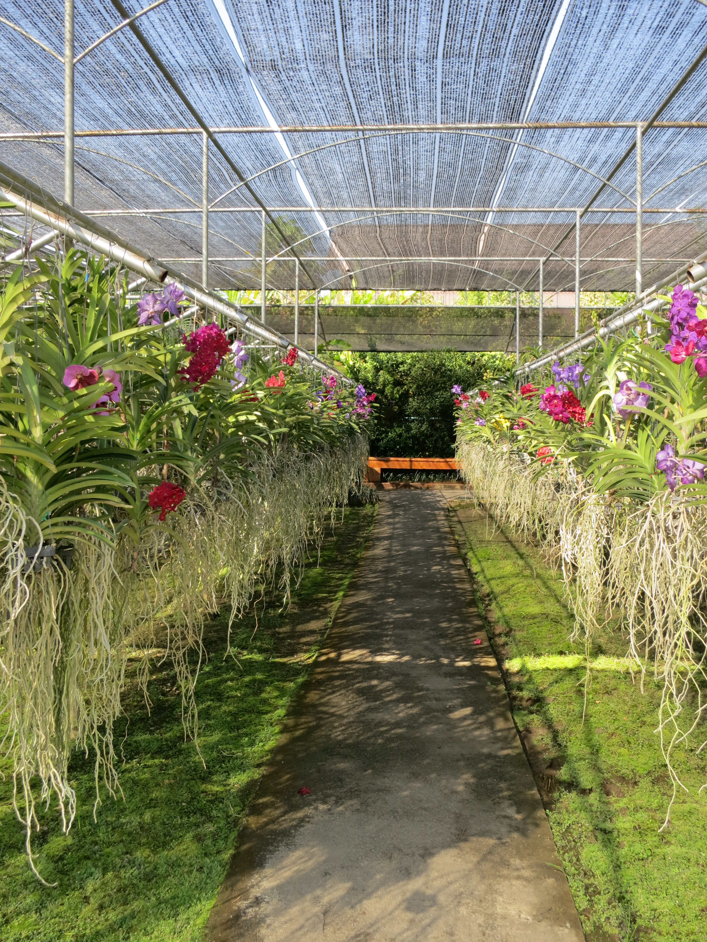 Looking down a row of orchids