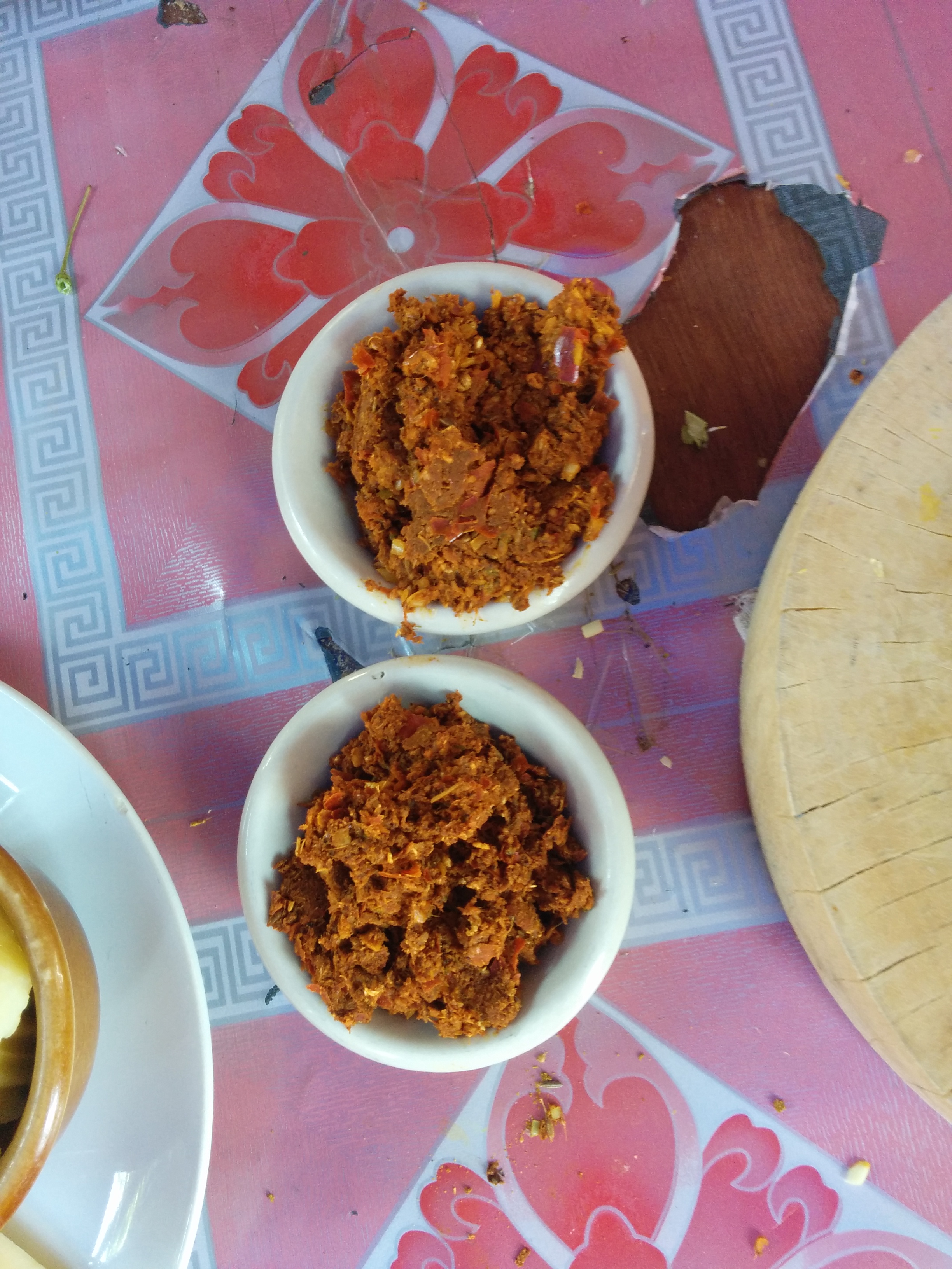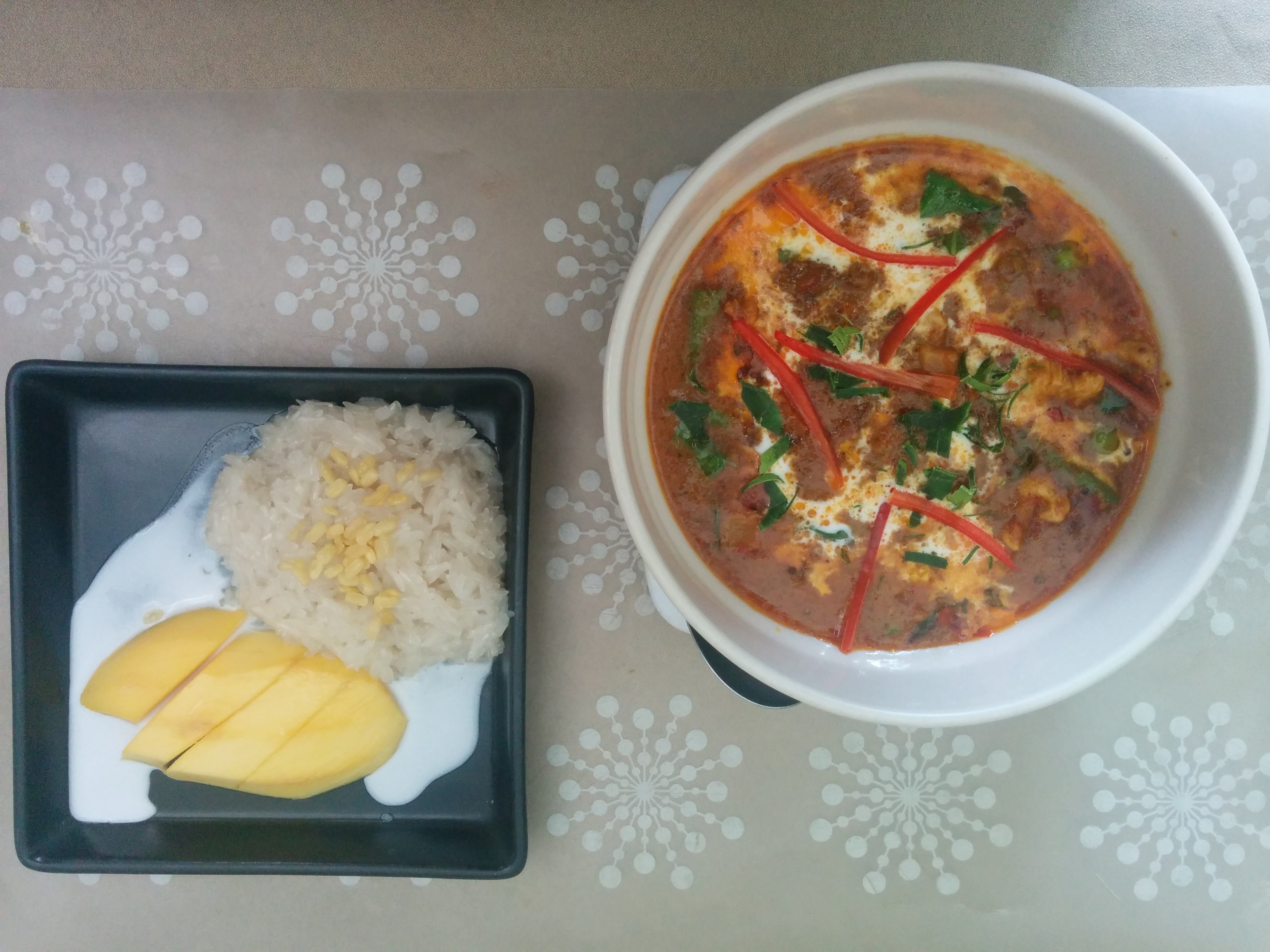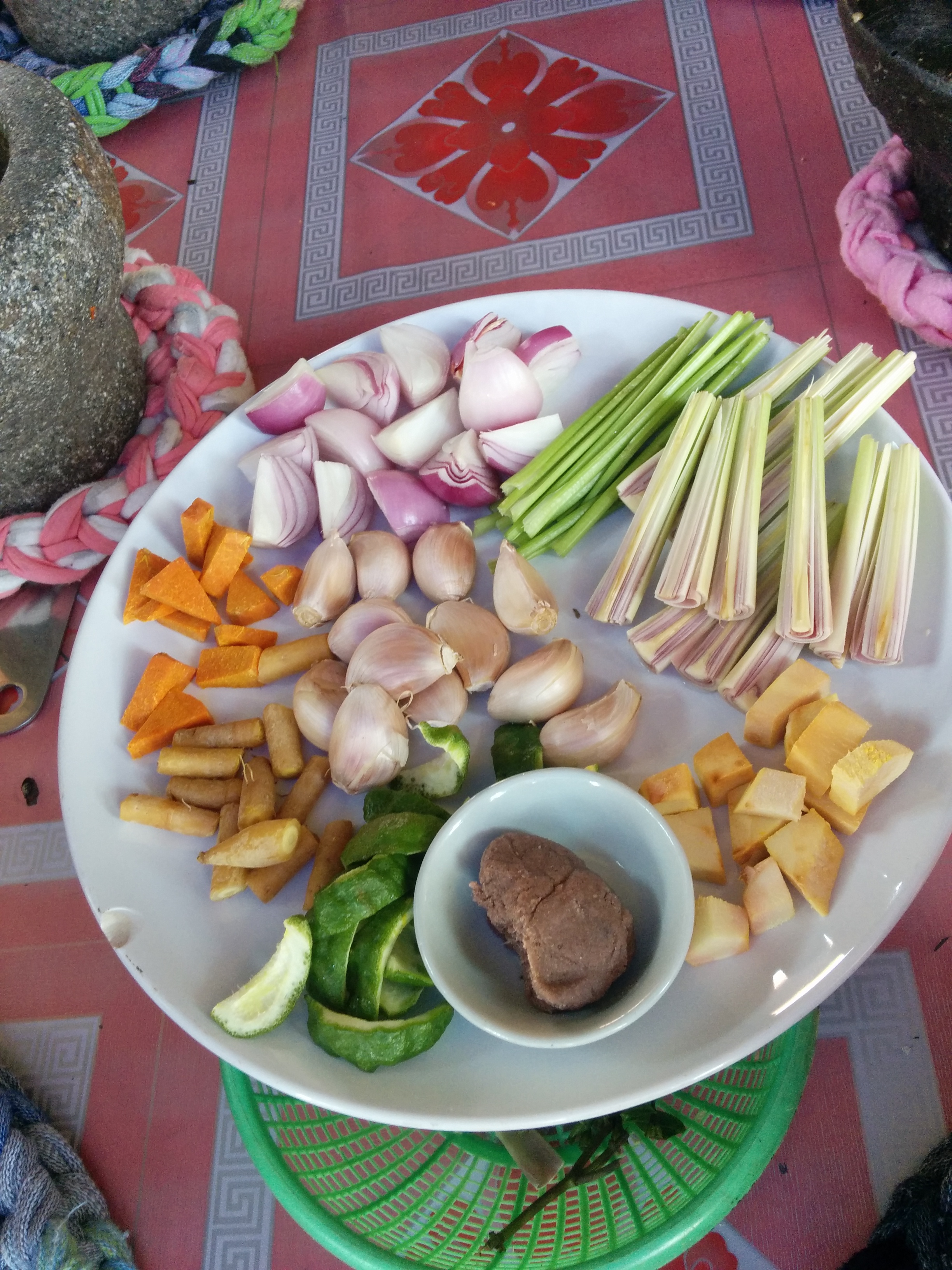 At 11 AM a songthaew picked us up and drove us to the cooking school, which was just the back half of a family house in the suburbs of Chiang Mai. We were the only people in the afternoon class, everyone else present had attended the full day class. We joined the party a little late. We started out doing a noodle dish; I learned to cook pad thai while Todd learned how to cook some other noodle dish (whose name we both forgot). After eating the pad thai (it was pretty good!) we moved onto making appetizers. I made a spicy mango salad, which I added too much spice too, while Todd made a spicy noodle dish. Both were alright, but far from the best part of the day. We next made a curry paste from scratch; then used it to cook a curry of our own. I made a panang curry while Todd made a massaman curry; both turned out to be delicious. We’re definitely going to have to try this again back in Waterloo, the only challenge will be adapting it to be cooked on an electric stovetop instead of gas. The gas provided much more heat much more quickly; we’ll need to adjust for that. Getting the ingredients may also be a bit challenging, but at the end of the class we were giving a recipe booklet so hopefully we’ll be able to figure things out. We got to chat with some of the other people attending the class; it was nice to chat with some new faces. After the curry we made a mango sticky rice, which was delicious, but at this point we were both too full to finish it.