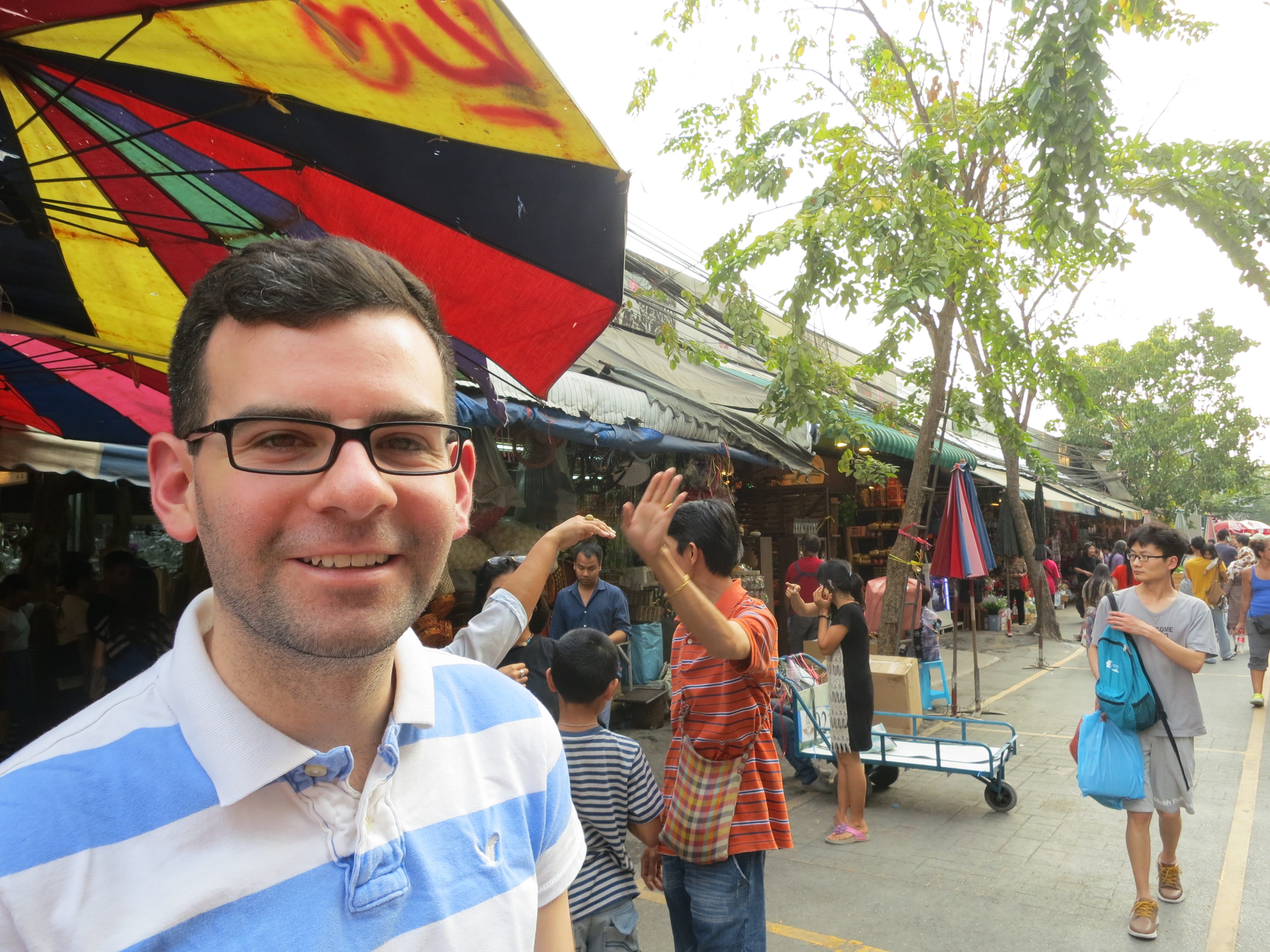 After climbing down the stairs from the station we quickly found ourselves in the middle of a crowd. The Chatuchak market is notable for being the largest weekend market in Thailand, hosting over 8000 stalls.Todd taking the market in