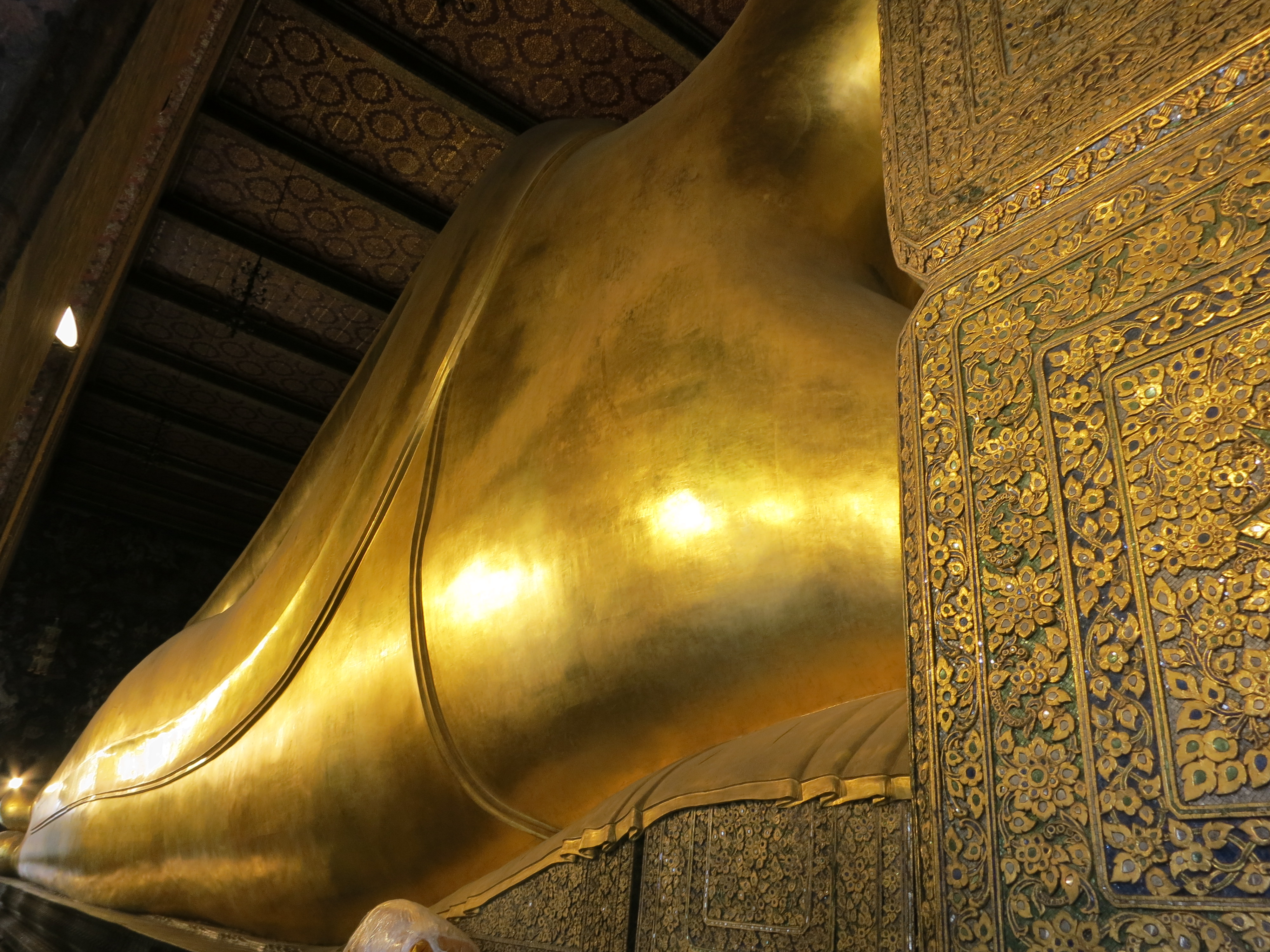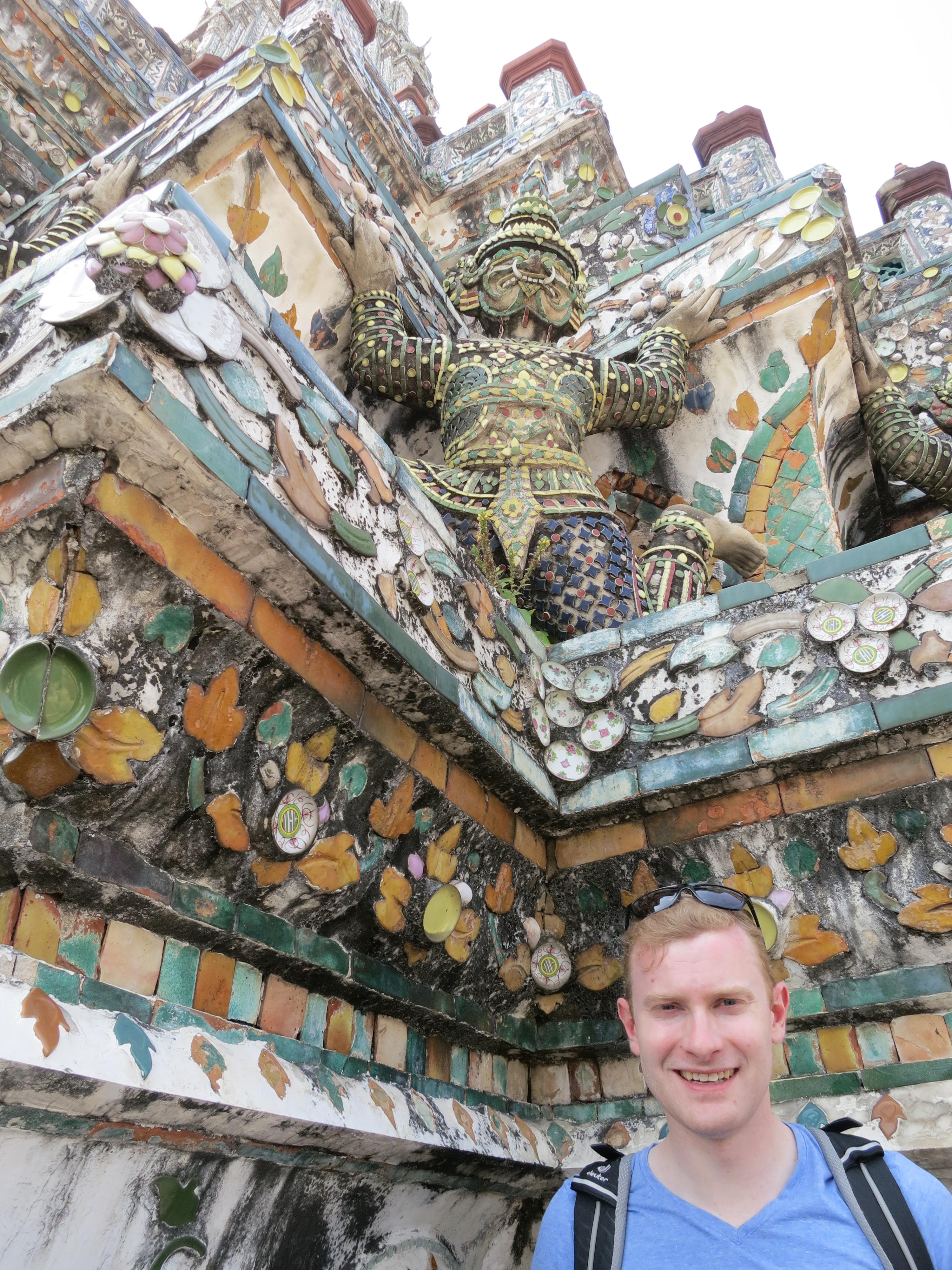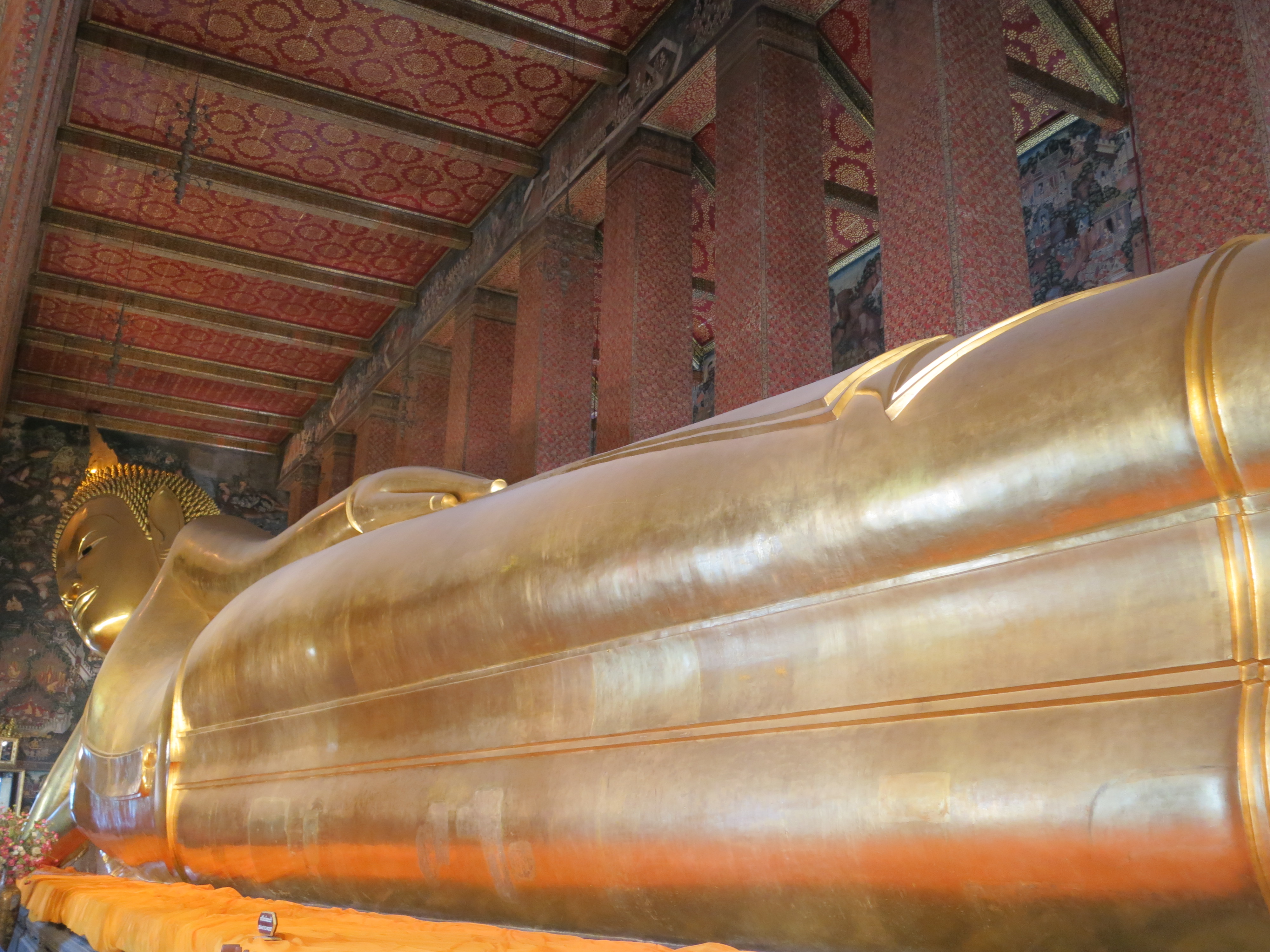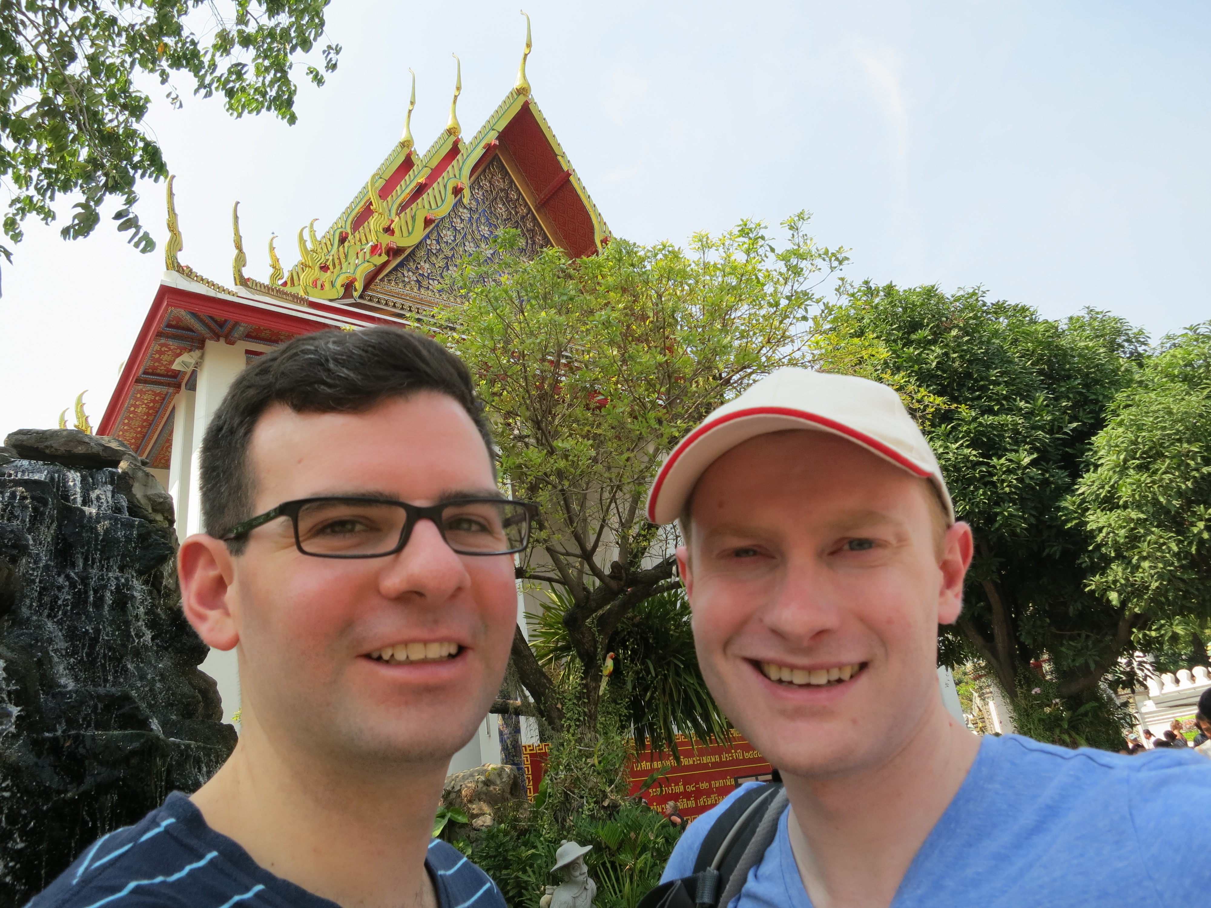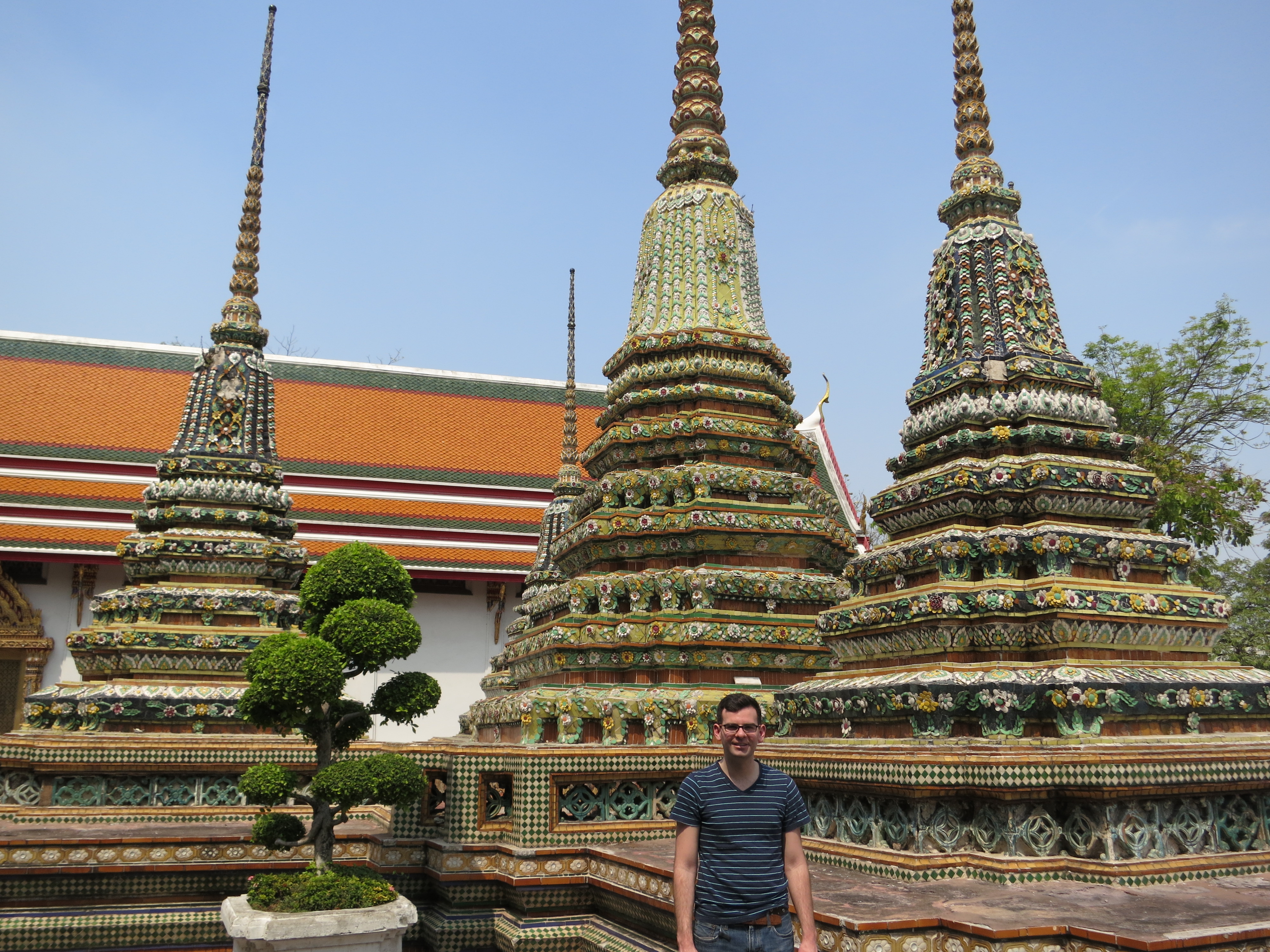 We disembarked the ferry at the Wat Pho station, and then walked from the station to the temple. The temple was, in some respects, neater than the Grand Palace; it had just as many buildings to see, and the statue of the reclining Buddha was very impressive. At 15m high and 46m long, it dominated the building enclosing it, and left an impact on all who saw it. This complex also took us several hours to visit, but we felt that we had enough time to see everything worth seeing.Todd and I outside the structure enclosing the reclining Buddha