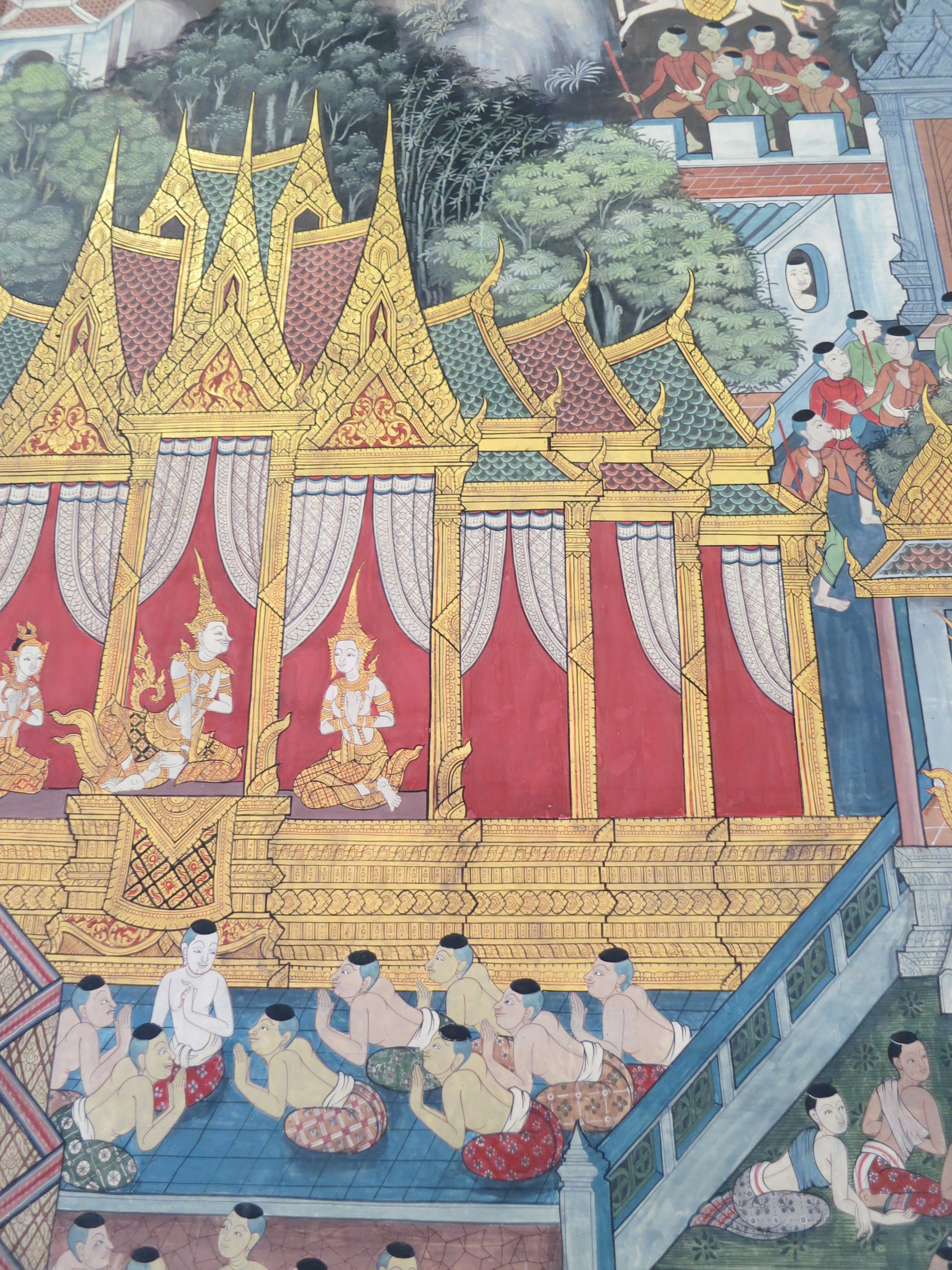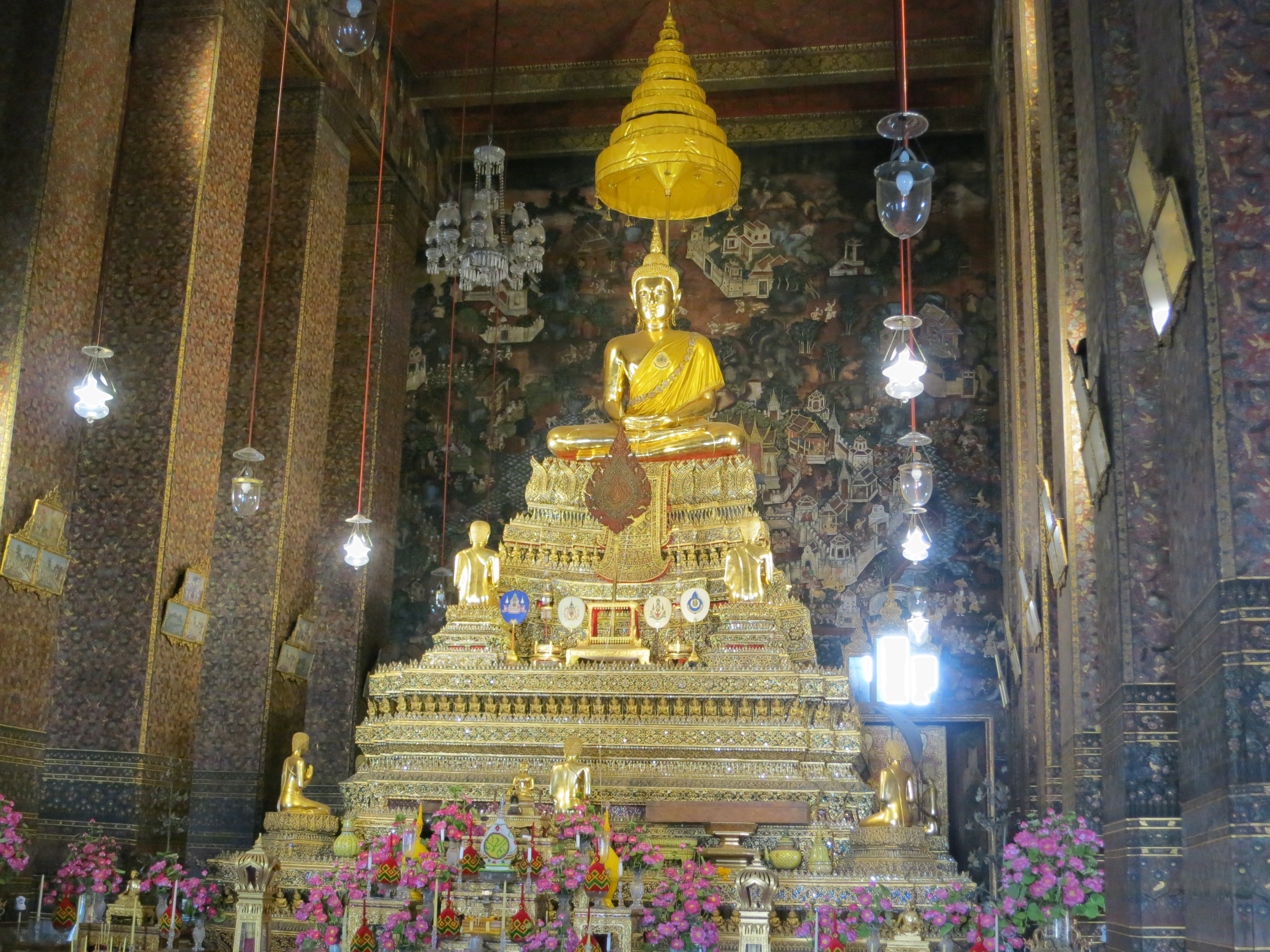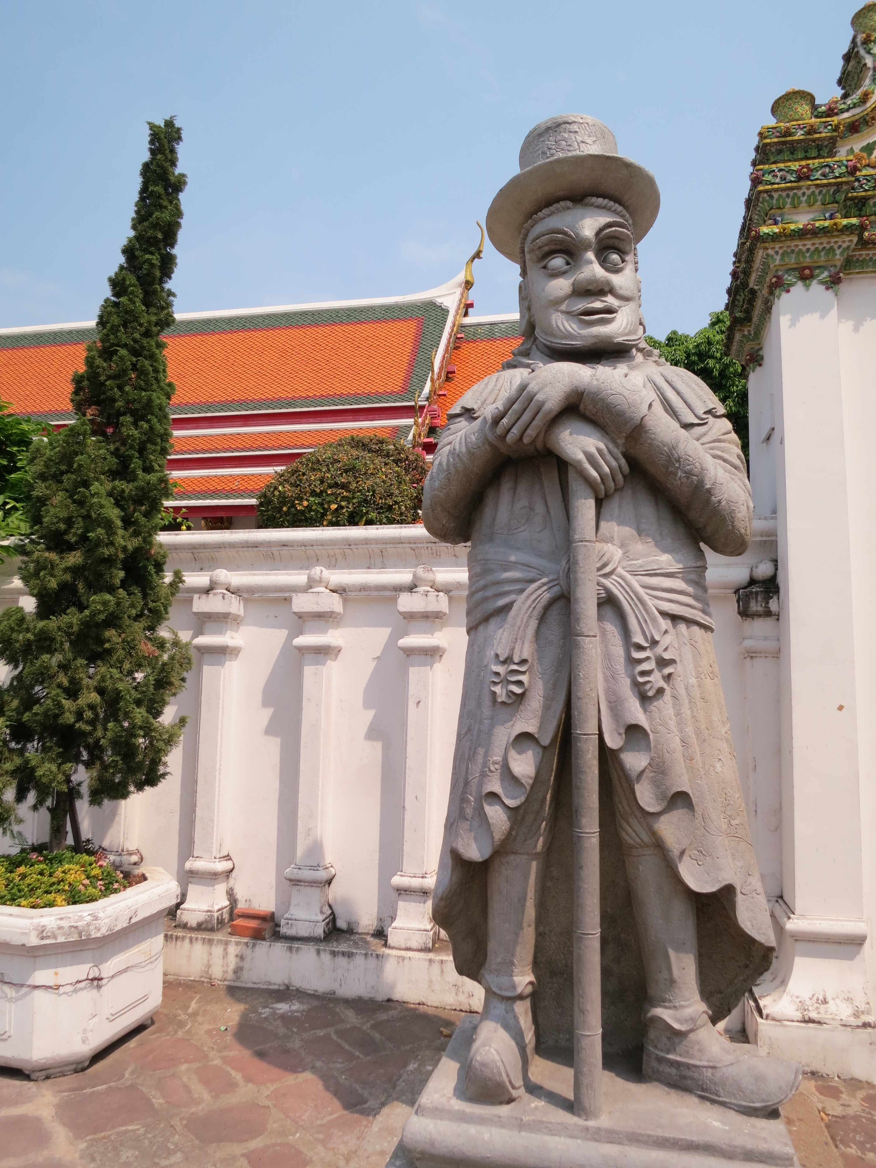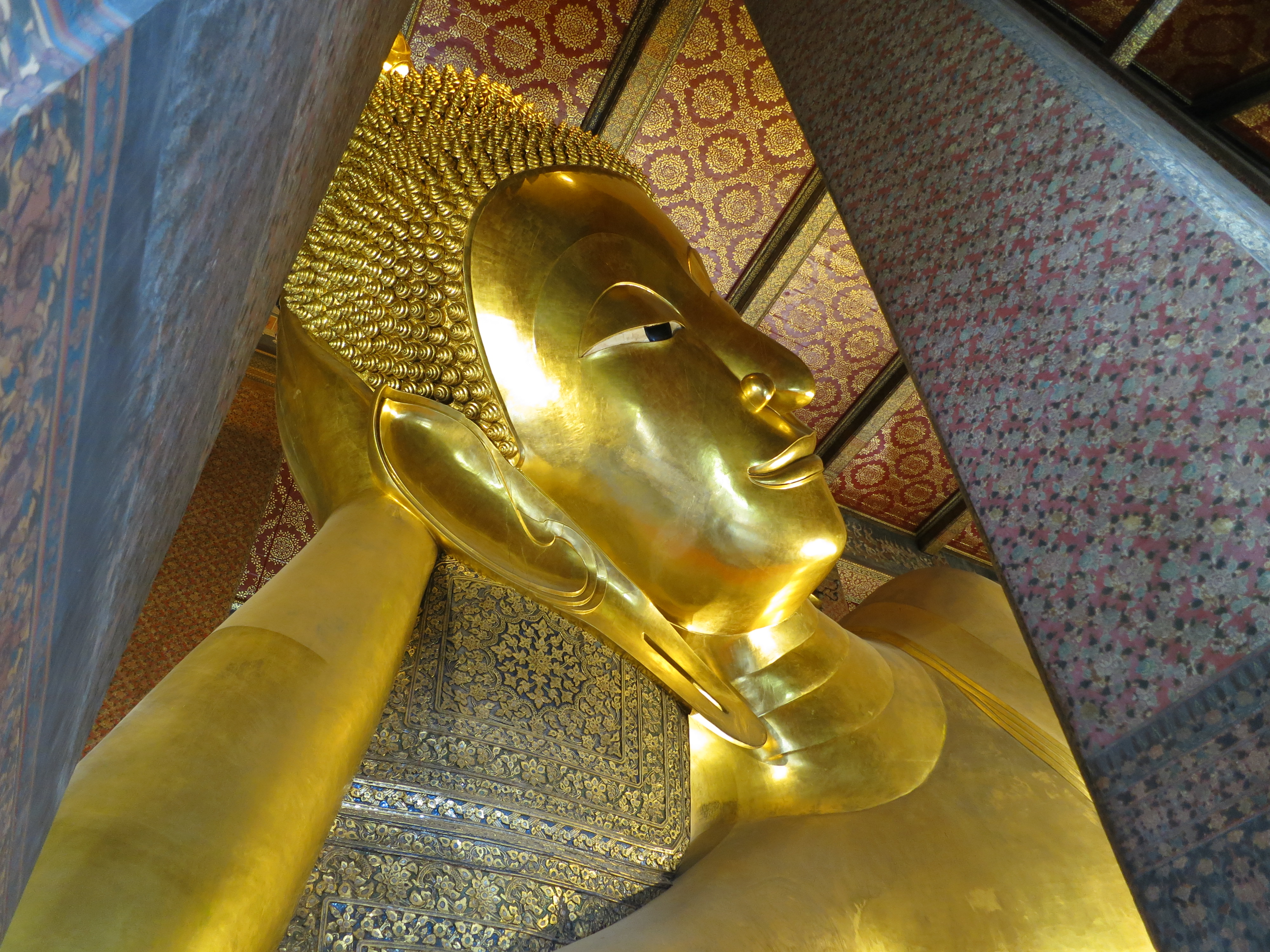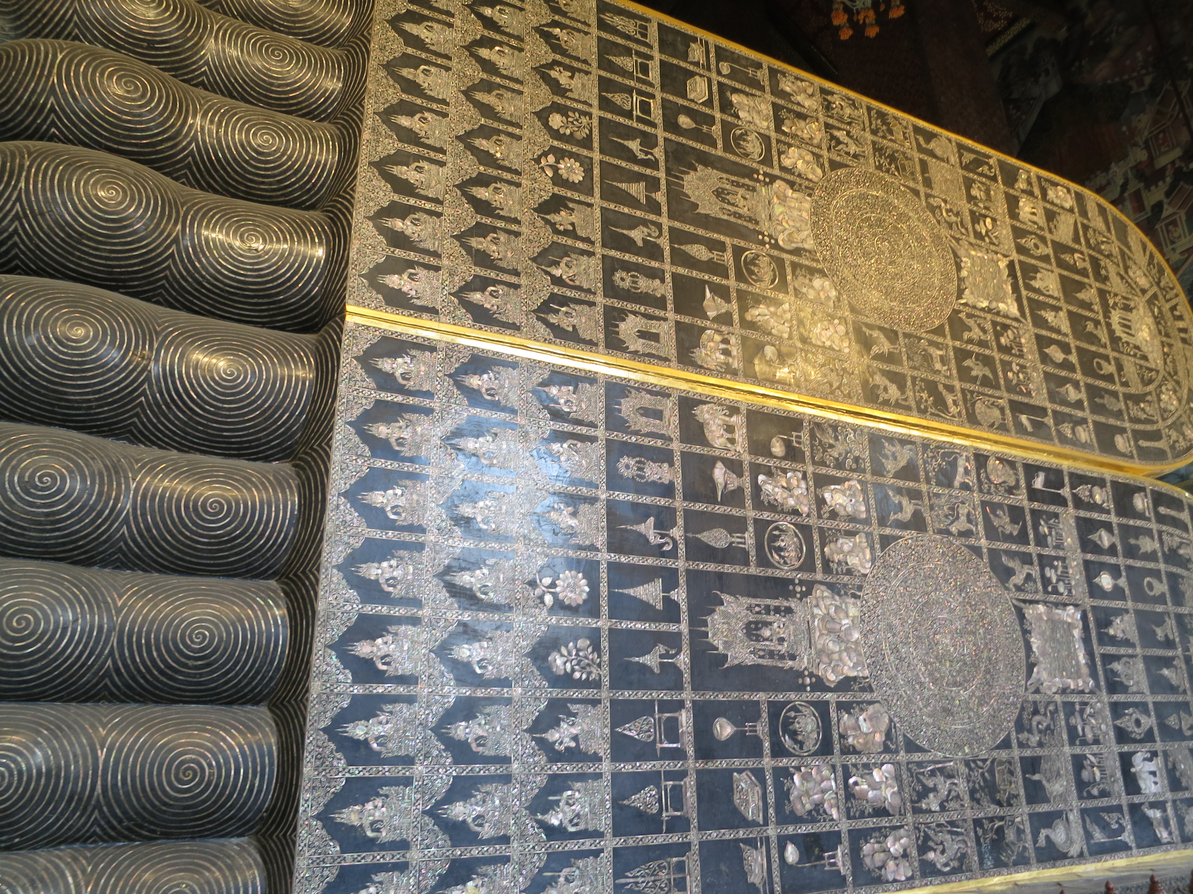 We disembarked the ferry at the Wat Pho station, and then walked from the station to the temple. The temple was, in some respects, neater than the Grand Palace; it had just as many buildings to see, and the statue of the reclining Buddha was very impressive. At 15m high and 46m long, it dominated the building enclosing it, and left an impact on all who saw it. This complex also took us several hours to visit, but we felt that we had enough time to see everything worth seeing.Todd and I outside the structure enclosing the reclining Buddha