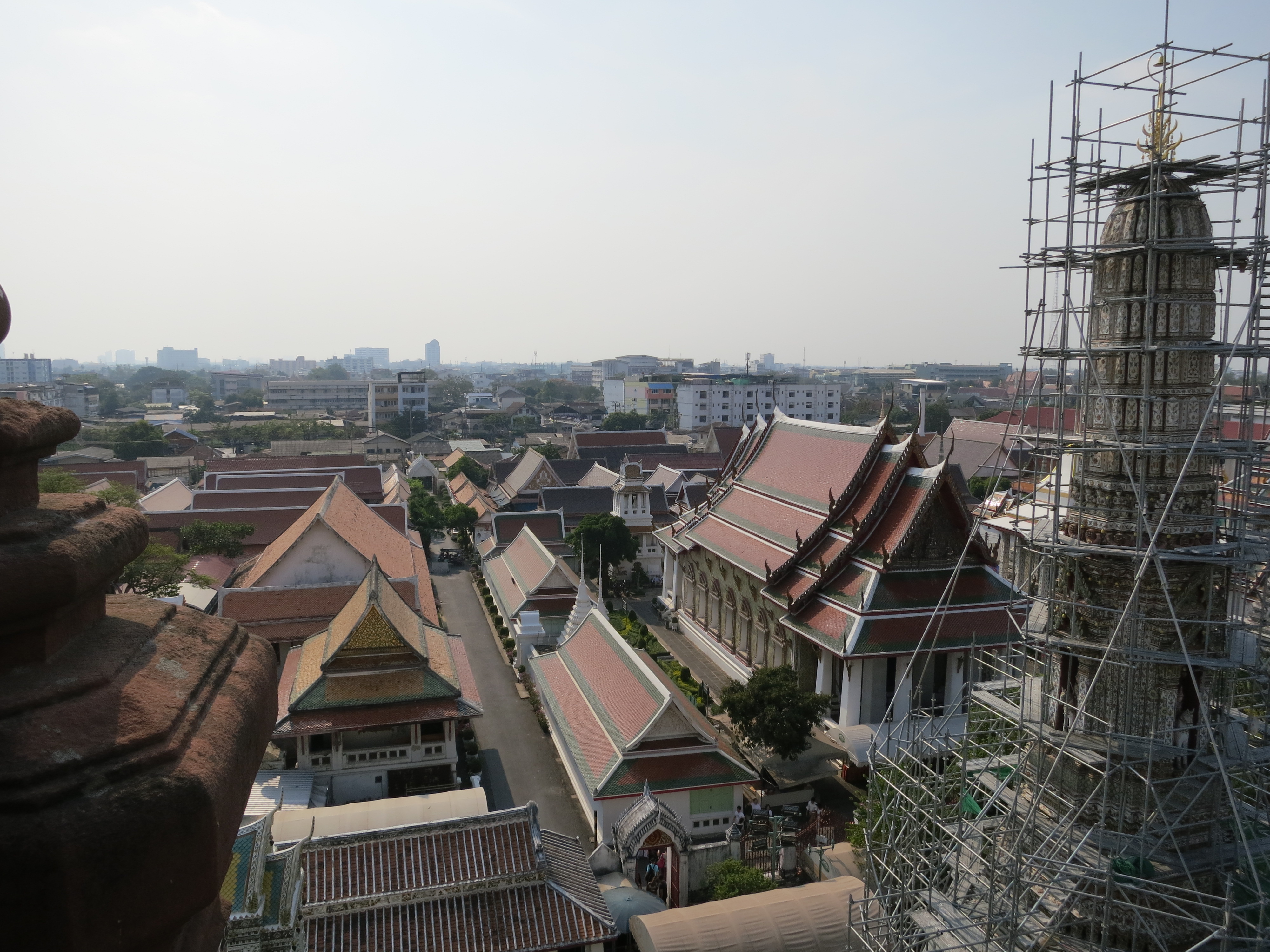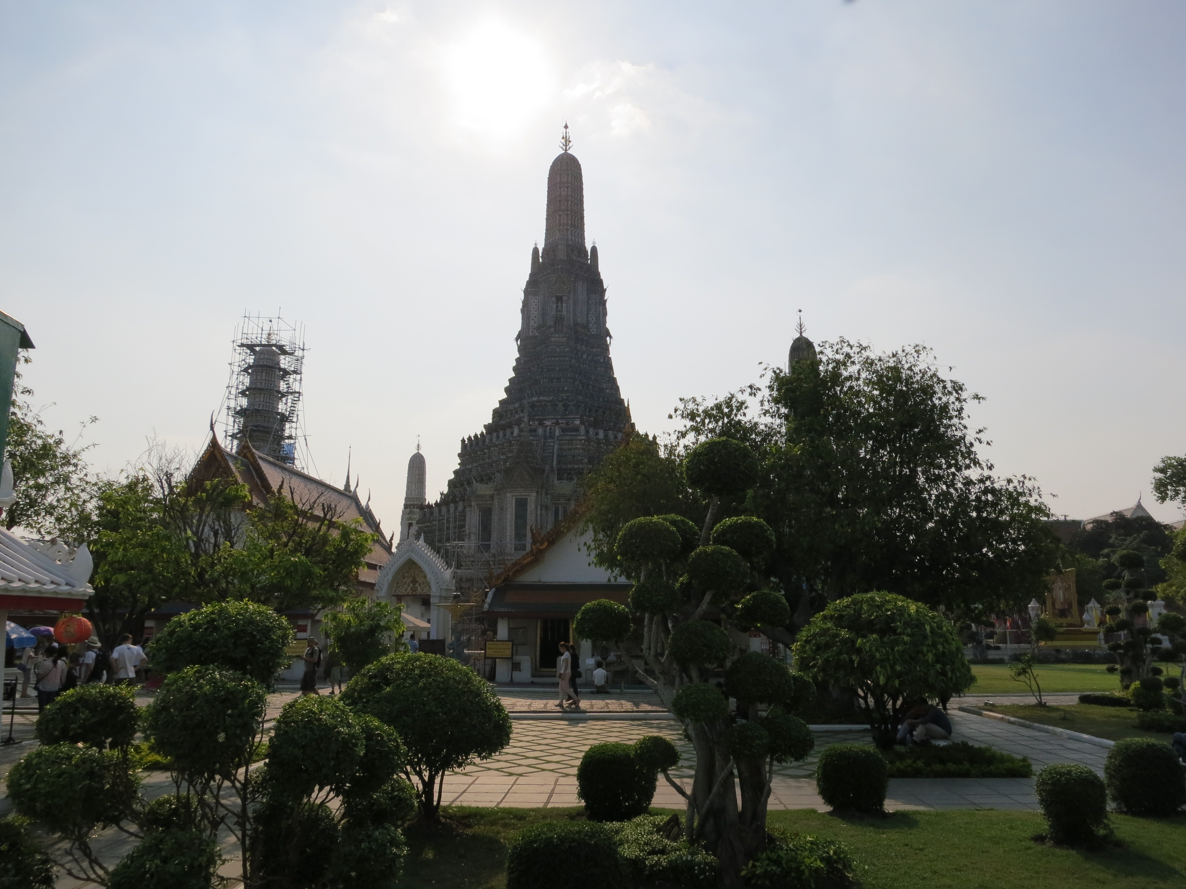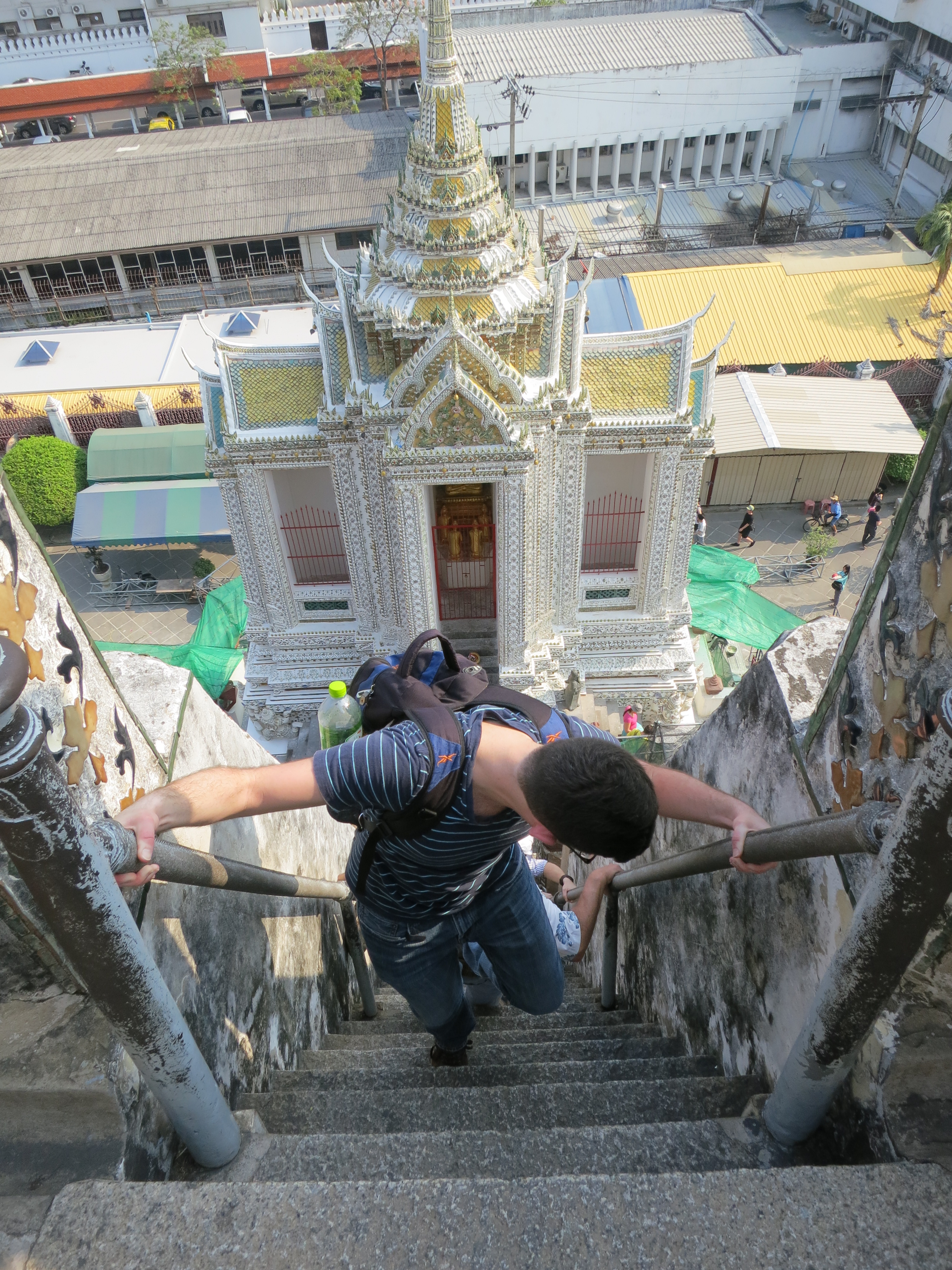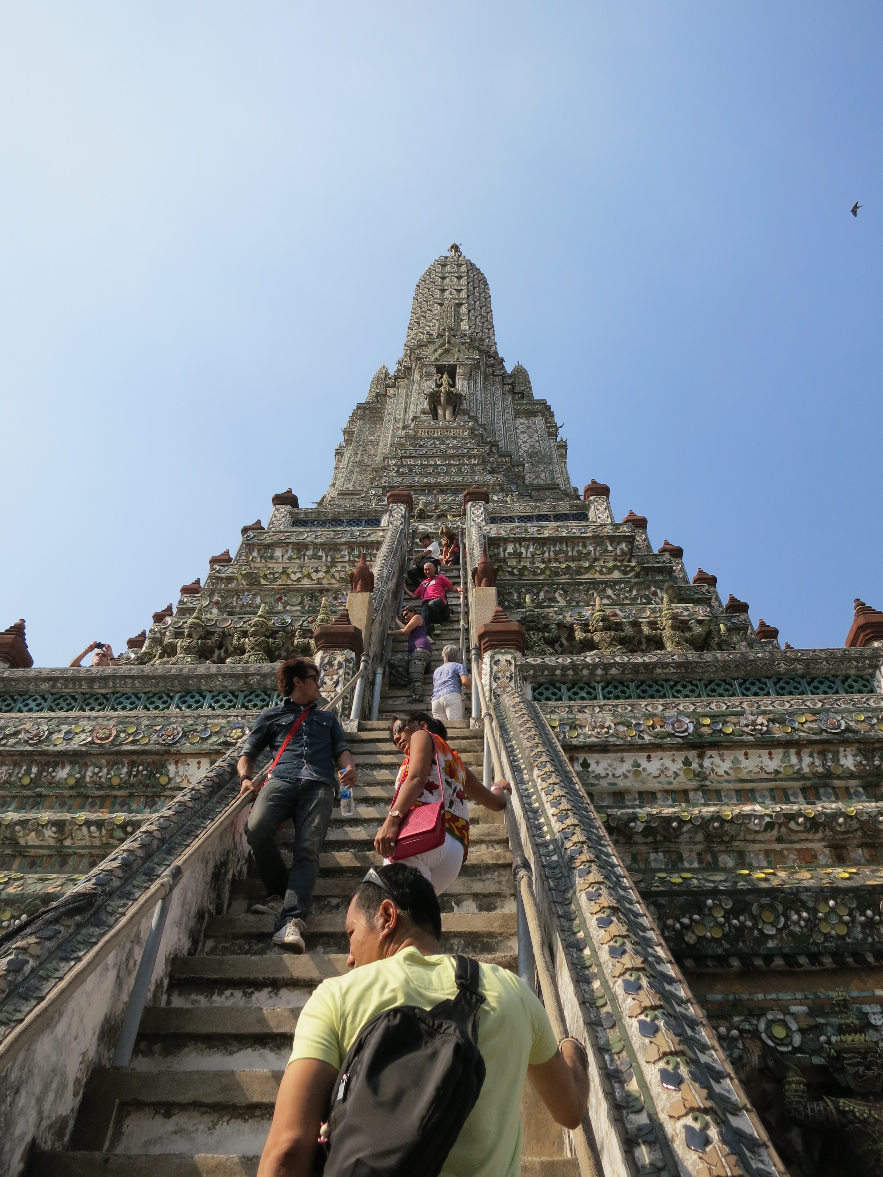 Wat Arun is much smaller than both the Grand Palace and Wat Pho, as it consisted only of a single structure. Staircases lead up all four sides of the structure; however, only one of the staircases is open for tourists above the first landing. Tourists are only allowed to go about halfway up the structure, however this is high enough to supply a fantastic view of the downtown core of Bangkok, both the Wat Pho temple and the Grand Palace, as well as the surrounding city. The temple staircases are incredibly steep; it seems surprising that people were able to make it up the exterior of the temple without the recently-installed metal railings.The top of Wat Arun from a distance